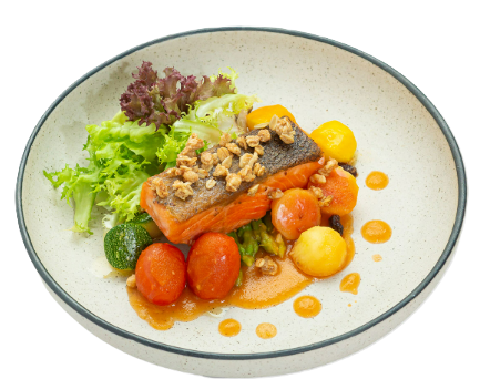 Cá hồi áp chảo sốt cà là món ăn bổ dưỡng, với miếng cá hồi vàng giòn bên ngoài, mềm béo bên trong, giữ trọn hương vị tự nhiên. Nước sốt cà chua chua thanh dụi ngọt hài hòa, thấm đẫm.
